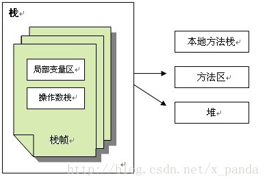 JVM执行class字节码,线程创建后,都会产生程序计数器(PC)和栈(Stack),程序计数器存放下一条要执行的指令在方法内的偏移量,栈中存放一个个栈帧,每个栈帧对应着每个方法的每次调用,而栈帧又是有局部变量区和操作数栈两部分组成,局部变量区用于存放方法中的局部变量和参数,操作数栈中用于存放方法执行过程中产生的中间结果。栈的结构如下图所示: